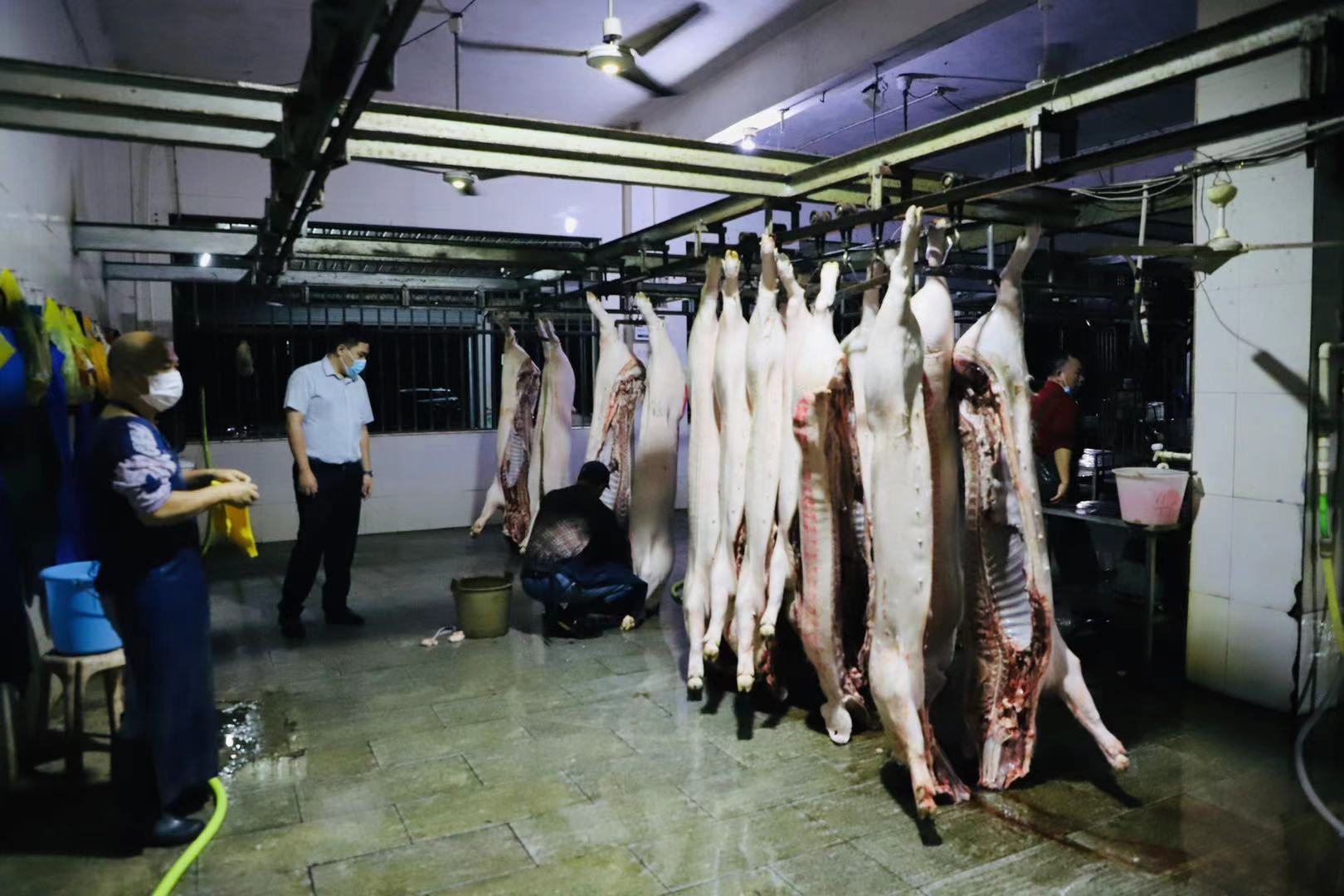 “戴好手套口罩,穿好膠鞋,進場前做好消毒沖水!豬肉分拆處理干凈就趕緊裝車,后面兄弟單位還在排隊,快快快!”凌晨兩點多,茂名濱海發(fā)展集團下屬子公司爵山食品公司燈火通明,屠宰工、清洗工數十余人已在緊張有序地開展生豬屠宰一線生產工作。